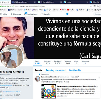 El primer paso fue la creación de una cuenta de Twitter, Feminismo Científico, @feminisciencia , que en apenas seis meses llegó a una nutrida audiencia hispanoparlante, con la particularidad de reunir interlocutores escépticos, masculinistas y feministas. Luego creamos un grupo en Facebook, Feminismo Científico, donde se desarrollan debates fértiles en un contexto de respeto y diversidad de opiniones.